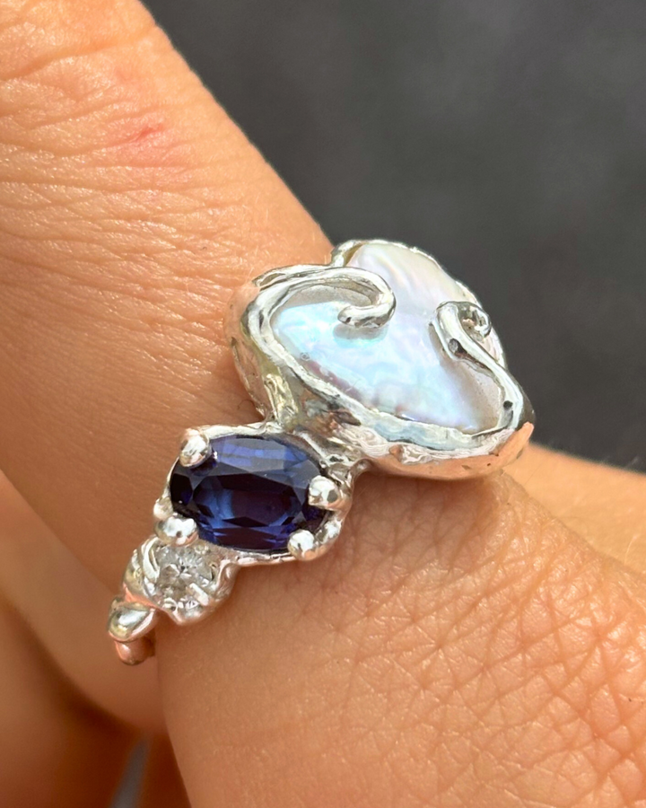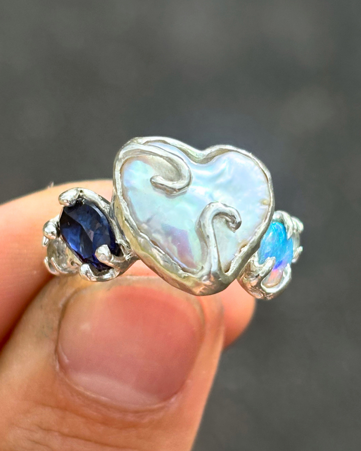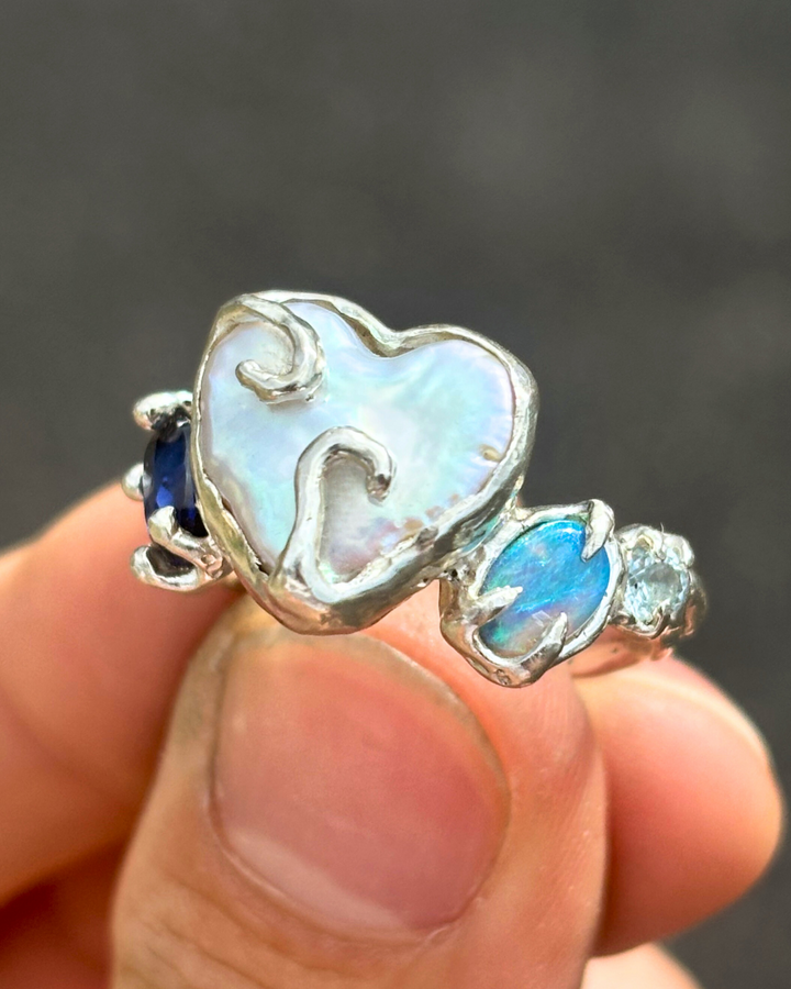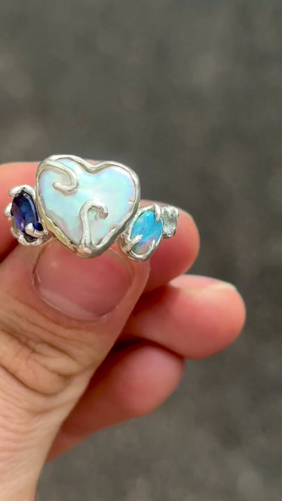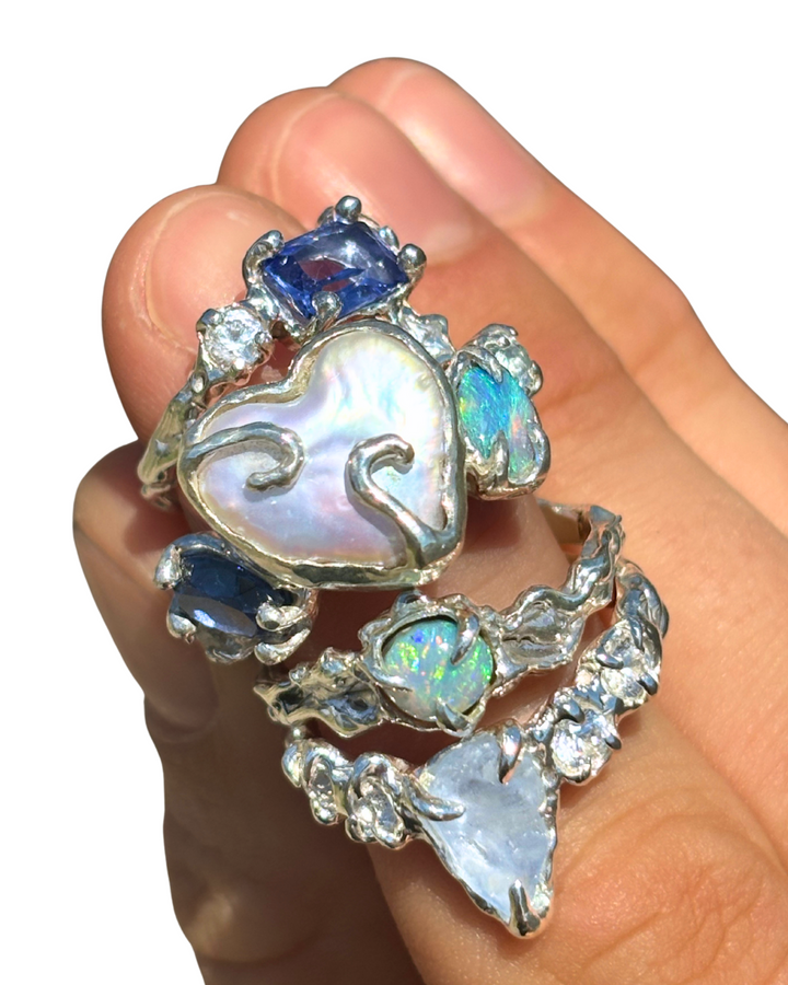 Aphrodite featuring heart shaped freshwater pearl, local Australian opal, lab grown deep sapphire, lab grown white sapphire, and natural topaz.
