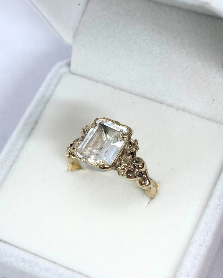 Featuring the tiniest hand-cut wildflowers cradling your perfect stone. Bluebell tells a delicate story, infused with yours in 9 karat yellow gold.
